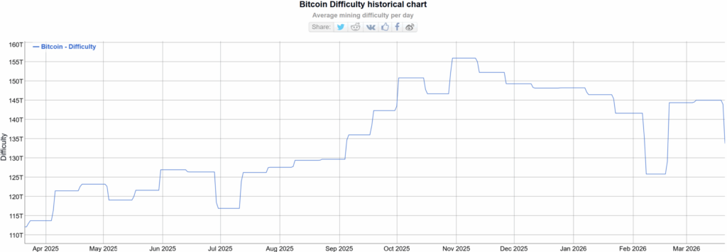 Bitcoin Records Second-Largest Difficulty Drop of 2026 as Hash Rate Remains Below 1 ZH/s